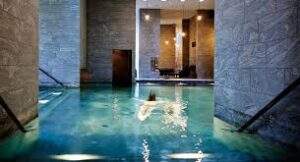 Vi får reserveret et område med borde og stole hvor vi kan sidde sammen i spaen og gå til og fra bassinerne, så det er muligt at være med på hyggen uden nødvendigvis at gå ned i vandet.