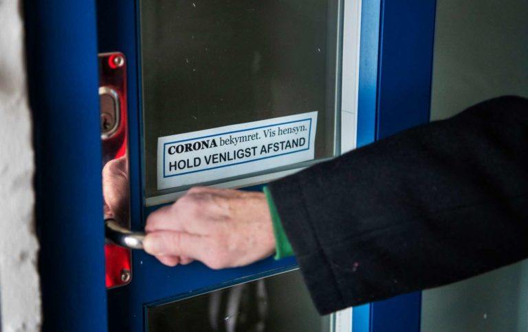 Corona bekymret. Vis hensyn. Hold venligst afstand, står der på døren til Johannes Gravgaards hjem. Han vil for alt i verden undgå smitte.