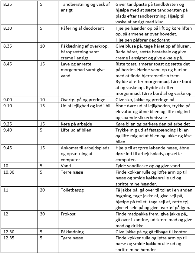 I stedet nåede kommunen i september frem til, at Antoniett skulle kortlægge, hvad hun laver og har brug for hjælp til næsten hvert eneste minut af sin dag.